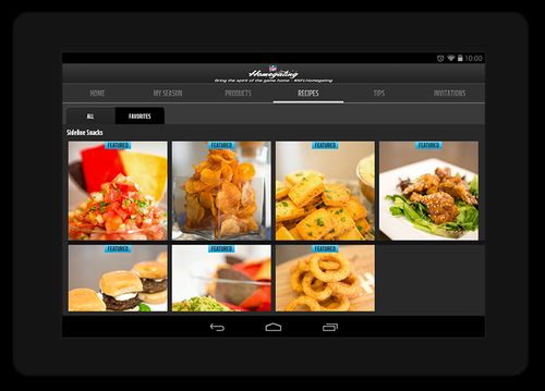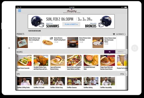 The app provided for selection of a favorite team. To then display related games and create 'homegating parties': A classic tailgate party, but in your driveway or backyard instead of the stadium parking lot. Offered features included invites, menus, recipes, party tips and a shopping list.